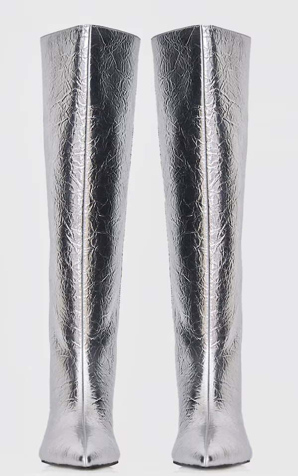 Estas botas plateadas hasta la rodilla son una adicion considerada a cualquier guardarropa moderno, punta afilada y tacon bajo crean un perfil refinado que con cada paso captara la luz, son versatiles para el dia y la noche, puedes combinarlo con un mini vestido y joyas.