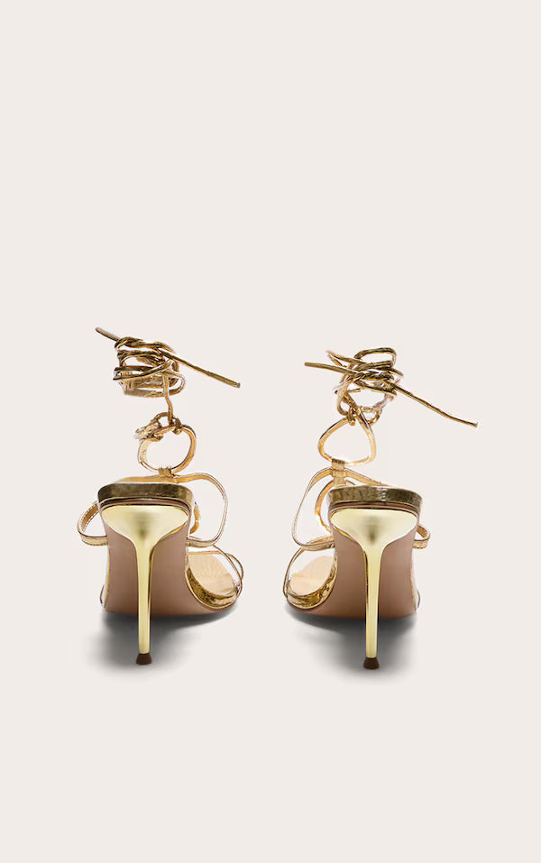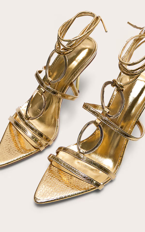 Sandalias de tacon, con cordon, anillo en la Punta de cocodrilo dorado.